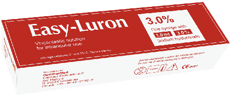 | • Keine Kühlung erforderlich • Gute Erhaltung der vorderen Augenkammer und des Kapselsackes • Kontrollierte Kapsulorhexis • Leichte Implantation • Bessere Haftung auf dem Cornealendothelium während der Phacoemulsification • Günstige Umgebung bei ophthalmologischen Operationen • Exzellenter Schutz gegen mechanische Beschädigungen • Mit Wasserdampf sterilisiert Easy-Luron ® erhalten Sie in 5 Konzentrationen. |